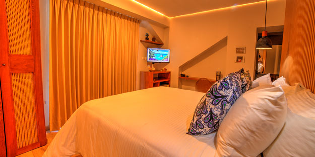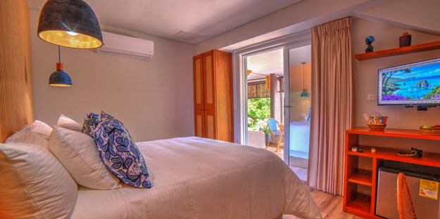 Reserva tu habitacion en nuestro Hotel en Islas del Rosario con cama Queen, aire acondicionado, wifi, desayuno a la carta y room service.